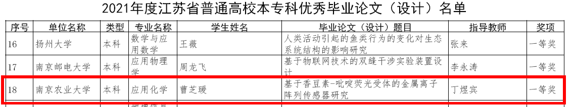 近日,江苏省教育厅公布了2021年度江苏省普通高校本科优秀毕业论文(设计)评选结果,我院化学系丁煜宾老师指导的2017级应化专业曹芝瑗同学的毕业论文《基于香豆素-吡啶荧光受体的金属离子阵列传感器研究》荣获一等奖。