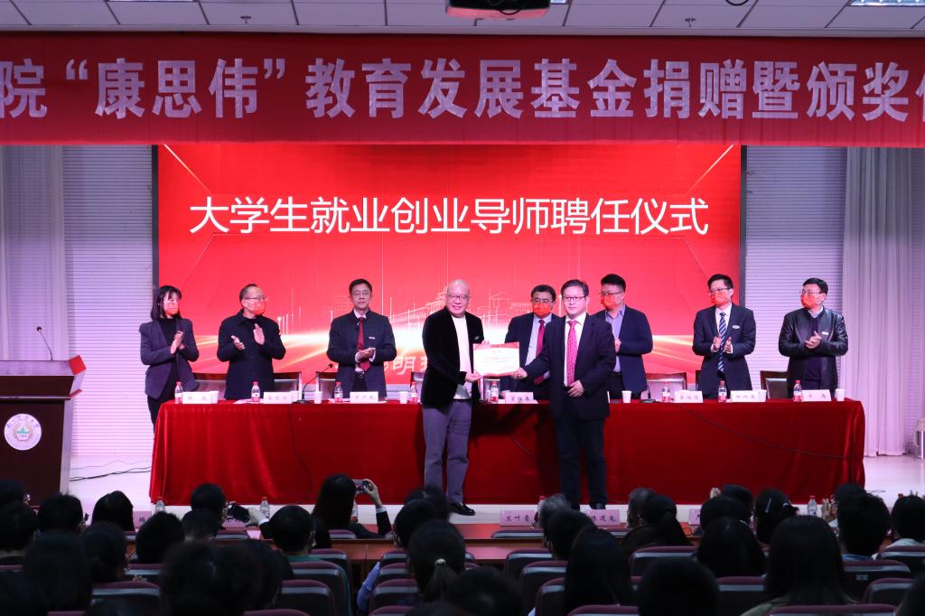 会议第二项议程为学院“康思伟”教育发展基金捐赠仪式,由邵士昌副主任代表学校接受康思伟医药科技公司教育发展基金捐赠,董维春副校长颁发“捐赠证书”。
