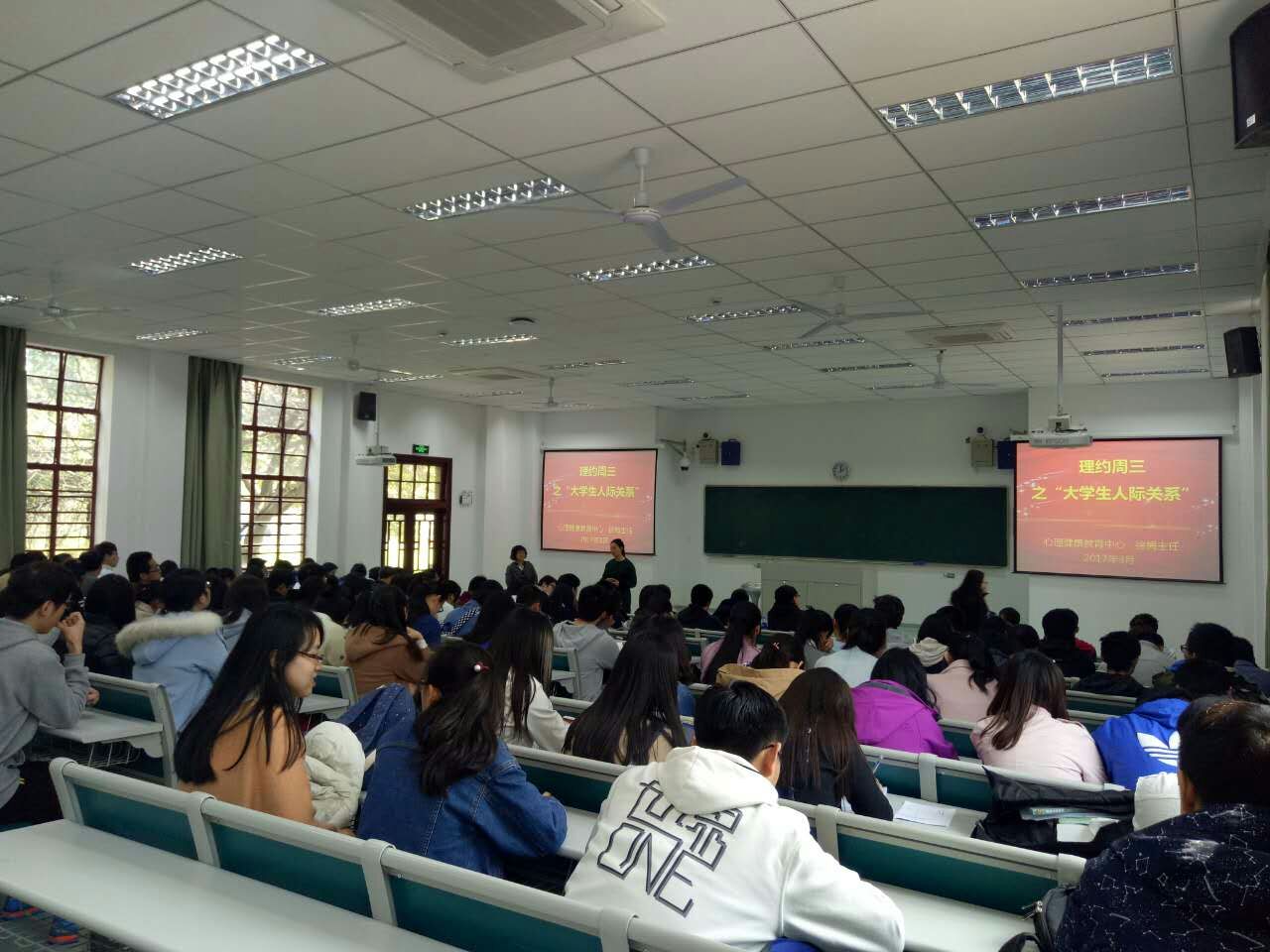 徐主任主要围绕三个方面展开此次培训:大学生人际交往的意义、特点以及改善。人际关系以需要为基础,以关系为纽带,以交往为手段。徐主任指出,对于大学生更应该注重矫正人际交往中的认知和偏差,注重良好的第一印象,认真对待每一次交往;积极去克服人际交往中的心理障碍;优化人际交往的艺术,比如优化个人形象,善用肢体语言,培养良好的表达能力,把握好的人际关系及策略。最后,她与在场的学生们分享了五个学会:学会化解压力,学会完善人格,学会规划人生,学会交流思想,学会珍惜生命。希望大家都能够做最好的自己!
