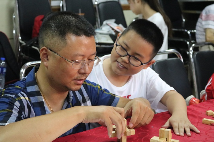 下午2时许,“致童年”实践团队携带实践活动所需的材料前往瑞金路明故宫苑电子阅览室,途中偶遇一位年近古稀的老奶奶正在公园里抖空竹,团队成员被老奶奶高超的空竹技术所折服,老人见状也停下来向同学们介绍说:“空竹一般为木质或竹质,中空,因而得名,是一种用线绳抖动使其高速旋转而发出的响声的玩具,也是一项十分有趣的中国民间游戏”。在电子阅览室,团队成员带领小朋友们探索中国传统玩具的奥秘,比如易拆难装的鲁班锁(又称孔明锁)。成员们细致又全面地向小朋友演示了鲁班锁的玩法以及其中的奥秘,小朋友们听了产生了浓厚的兴趣,并跟着同步操作。在成员们的悉心指导下,小朋友们也都学会了鲁班锁的拆装,获益颇多。